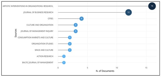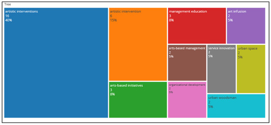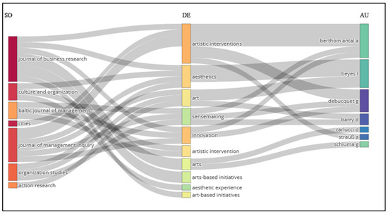 Continuing with this title-based analysis approach, the results obtained from the R Studio software can be utilized to construct a three-field plot, enabling the simultaneous visualization of three variables (Figure 5). The term “Artistic Intervention” emerges as the most commonly utilized keyword by authors, particularly prevalent in the Journal of Business Research, which holds a prominent position in comparison to other journals (a more comprehensive journal analysis can be found in Section 3.3).