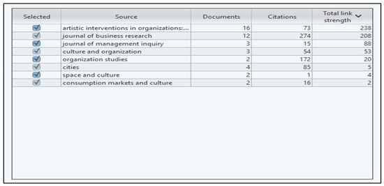 With a minimum threshold of two articles per journal exploitation of the sample yielded eight journals. “Artistic intervention in organization” and “Journal of business research” are the two journals with the most publications and links (Figure 11).
