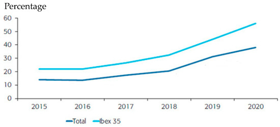 According to the latter authors, a company’s compliance with gender recommendations included in the codes of good governance was greater than that with the soft quota law, especially in the case of companies that make up the IBEX35 (Figure 2). The results from the study indicate that, for Spanish companies, the recommendations in the CGG are more effective than the incentive to formalize contracts with public administrations established by the quota law.