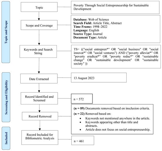 Figure 1 presents the literature search strategy, inclusion, and exclusion processes. The Web of Science database was used for searching the articles published during 1998–2022. It contains highly prestigious journals, historical data coverage, and data consistency and is therefore frequently used in bibliometric studies in business and social science research (; ). Due to the purpose of this study, Web of Science was selected for more impactful studies, particularly longitudinal studies and detailed citation analyses other than the Scopus database (; ). Previous studies have also adopted this robust dataset for the same reason (; ). A combined search string, TS = ((“social entrepren*” OR “social business” OR “social innovat*” OR “social ventures”) AND (“poverty alleviat*” OR “poverty eradicat*” OR “poverty reduc*” OR “sustainable change” OR “sustainable development” OR “sustainable society”)), was constructed and run using the advanced search option available in the database. The ‘TS’ field in WoS covers titles, abstracts, author keywords, and Keywords Plus. The Boolean “OR” and “AND” operators were used for searching for more relevant literature. The ‘OR’ operator connects synonyms or related terms within each thematic area, broadening the search scope. For instance, (“social entrepren*”) OR (“social business”) captures various forms of social entrepreneurship. The ‘AND’ operator then intersects only those studies that address both social entrepreneurship and aspects of poverty alleviation or sustainable development (). Truncation symbols like asterisk (*), quotation marks (“”) are used to search for different word variations. For example, “entrepren*” retrieves entrepreneur, entrepreneurship, and similar variations. Quotation marks (“”) are employed to search for exact phrases, ensuring precision (). The keywords relating to poverty and sustainable development were selected to encompass the broad scope of social entrepreneurship, focusing on its role in both poverty alleviation and sustainable development (). These terms, while not synonymous, are crucial to understanding the multifaceted nature of social entrepreneurship. The intrinsic link between poverty alleviation and sustainable development is underscored by their integration into the United Nations’ Sustainable Development Goals, especially Goal 1 (No Poverty) (). The terms reflect different strategies towards poverty, e.g., alleviation implies immediate actions, eradication suggests completely ending poverty, and reduction refers to long-term strategies. The search criteria were restricted to peer-reviewed articles, excluding conference proceedings, books, and book chapters, to ensure the quality and validity of this research. Such academic articles undergo a rigorous peer-review process. These are characterized by their scientific methodologies and reliance on empirical studies, offering reliable and current information (; ). Furthermore, the study included articles that were published until 2022 to consider the full calendar year. The broad search strategy identified a total of 572 articles after searching keywords in the title, abstract, and author keywords. Later 89 articles were excluded because of inclusion criteria (English language article, time span, and Web of Science index). In addition, 22 articles were found irrelevant to the social entrepreneurship field. The data were cleaned using Microsoft Excel by considering keywords that did not appear in the title, abstracts, anonymous authors, and articles that did not focus on related fields. Only articles published in English were selected because it is the dominant language for scientific communication and provides the widest accessibility for research findings (). Finally, 461 articles indexed in the Social Sciences Citation Index (SSCI), Emerging Source Citation Index (ESCI), and Science Citation Index Expanded (Sci-Expanded) were considered. These databases index high-quality research articles and high-impact peer-reviewed articles.