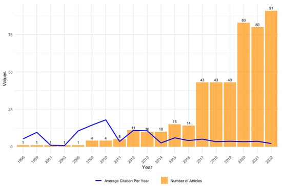 Articles per year. (Notes: Evolution of the number of articles over the years since 1998. Articles published until December 2022 were included. The Figure is based on a sample of N = 461 articles).