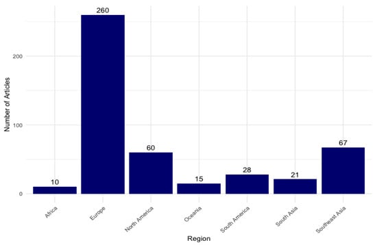 On the other hand, Figure 3 demonstrates the geographical production of research in the field of social entrepreneurship research across various regions. It clearly shows that Europe leads with a substantial 260 articles, followed by Southeast Asia with 67 and North America with 60. In contrast, South America, South Asia, Oceania, and Africa exhibit fewer research articles, with counts of 28, 21, 15, and 10, respectively. According to previous studies by (), Europe has a stronger tradition of academic research, with well-established institutions and programs focusing on social issues. Resource availability, funding dedicated to academic research, and access to a broad network of scholars drive more research. Furthermore, research in Europe often has a direct link to policy-making, which drives studies in areas like social entrepreneurship (). However, developing nations, for example, African countries, face unique challenges, e.g., access to finance and poor policy are the major challenges (). In South Africa, the social and solidarity economy policy is yet to be implemented, and there is no legal framework for social enterprises, which affects how social entrepreneurship is practiced and perceived in the country ().