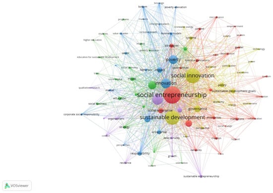 Keyword co-occurrence refers to the phenomenon where specific keywords or terms appear together in scholarly publications, such as academic papers and articles. This analysis involves identifying and quantifying the frequency with which pairs or groups of keywords appear in the same documents (). It is a valuable technique in bibliometrics to understand knowledge mapping, research trend identification, and content analysis (). Researchers and institutions can gain a deeper understanding of the structure and dynamics of scientific knowledge and insights about future research trends and collaboration networks (; ). The network structure of keyword co-occurrence results is displayed in Figure 5. The current study used VOS viewer to identify the most frequently used keywords and set the minimum threshold at seven occurrences on a sample of 461 articles. A total of 95 keywords had reached the threshold after excluding country names and acronyms. Table 8 presents the top 15 keywords in the co-occurrence analysis. The keyword “social entrepreneurship” holds the highest frequency at 162 occurrences, followed by “social innovation” with 125 appearances. Among other frequently used keywords are “sustainable development”, “entrepreneurship”, “governance”, “hybrid organization”, “policy”, “management”, and “social enterprise”. Subsequent to this, a co-occurrence analysis of keywords was conducted to identify thematic clusters (Table 9). Using this technique, five distinct clusters were identified, each of which contains a unique combination of keywords in a specified color. Keywords consisting of red and yellow clusters indicate the strongest theme. The clusters show interrelated concepts such as social innovation, social enterprise, social entrepreneurs, policy, social change, etc. They collectively indicate the significance of developing entrepreneurial mindsets regardless of gender and culture. Whereas, the keywords in the yellow cluster emphasize the strong link between the role of social innovation and sustainable development. Keywords in this cluster suggest sustainable innovation and foster collaboration among various stakeholders. Other clusters (blue and purple) also shared some common areas of social entrepreneurship, especially inclusive business growth and social business, and were closest to the red cluster. Both clusters have a significant impact and are emerging research domains. For example, corporate social responsibility, innovative business models, and sustainability practices drive social entrepreneurs’ commitment to create value for the community. The green cluster is less closely related but has a significant impact, for example, on the role of higher education, particularly universities, in supporting social entrepreneurs through the development of innovative ideas, technology, incubator models, and partnerships with various stakeholders. However, the degree to which keywords tend to group together is taken as an indication of how frequently they express similar ideas.