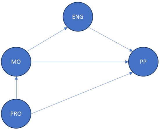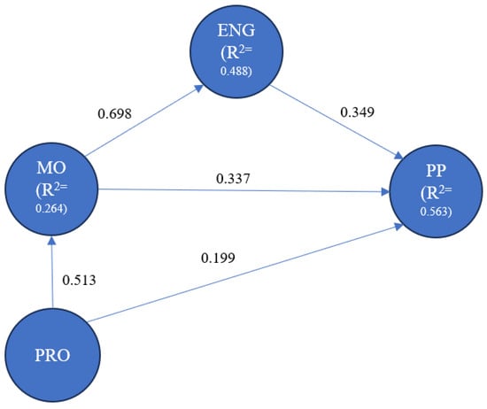 The effect size f2 was also assessed to evaluate the change in the R2 when a specified independent variable is omitted from the model. This indicates whether the removed variable produces a relevant impact in the endogenous variables (Hair et al. 2022). The results show that removing the ENG variable from the model produces an effect size of 0.143 in the R2 of variable PP, removing the MO variable produces an effect size of 0.951 in the R2 of variable ENG and of 0.115 in the R2 of variable PP, and removing the PRO variable produces an effect size of 0.358 in the R2 of variable MO and of 0.067 in the R2 of variable PP. Effect size results of 0.35, 0.15, and 0.02, represent large, medium, and small effects, respectively (Cohen 1988). Figure 2 presents the structural model, the direct effects, and the obtained R2 results.