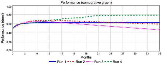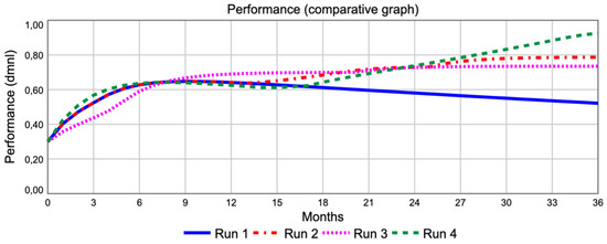 The trend of performance during the considered operating period (36 months) is shown in Figure 4. It can be observed that the model generates a performance value that does not reach the desired target (0.8), although the gross profit value exceeds that observed in Run #1.