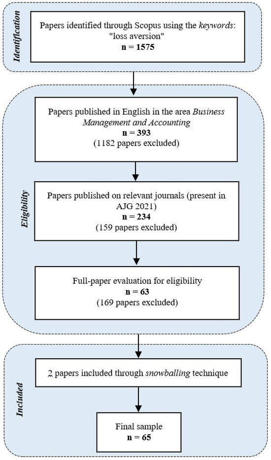 - To conclude the eligibility phase, the authors collaborated to assess the alignment of the chosen papers with the research objectives. Consequently, the authors thoroughly reviewed all the papers, and the final sample incorporated those contributions that addressed the topic of managers’ loss aversion and its impact on the corporate value creation process within any given organisation. A significant number of papers were excluded as they solely examined loss aversion in individuals from the perspective of customer preferences or personal finance, without considering the corporate viewpoint. At the conclusion of the eligibility phase, 63 papers were ultimately selected.
