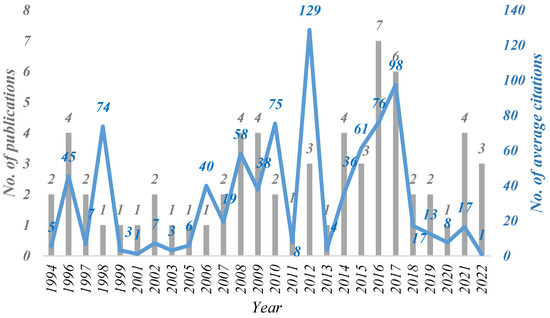 Examining the temporal distribution of papers reveals more than just a consistent upward trajectory in research interest regarding the topic. Figure 2 illustrates the initial emergence of significant discussions concerning managerial loss aversion in corporate value creation during the 1990s. These early discussions anchored loss aversion within fundamental management accounting judgments and decision-making contexts such as budgeting (Lee 1994) and the recovery of sunk costs (Schaubroeck and Davis 1994). By 2016, there was a peak in the annual number of publications (7), with several studies investigating the principal–agent relationship, specifically focusing on the impact of agents’ loss aversion on business performance when control mechanisms are inadequate (Grolleau et al. 2016; Marchegiani et al. 2016). Moreover, Figure 2 demonstrates a similar trend in the average citations per year. However, the pinnacle of citations attained by Chrisman and Patel (2012) underlines the considerable influence of managers’ loss aversion on decisions related to investment in research and development (R&D).