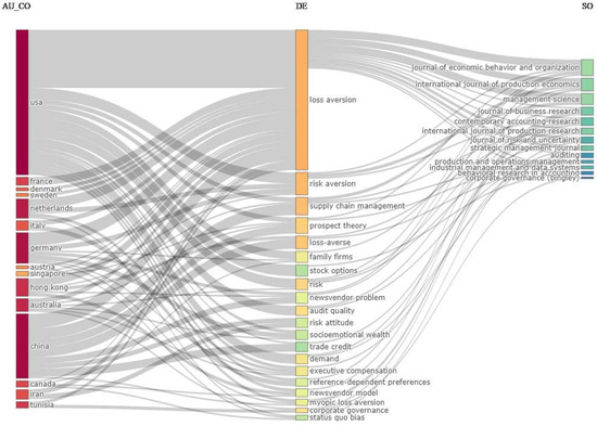 In Figure 3, the authors present a comprehensive depiction of authors’ nationalities, keywords and sources of contributions using a three-field plot generated via Biblioshiny (Aria and Cuccurullo 2017), specialised software employed for quantitatively synthesizing research streams (utilised in other authoritative business studies, such as Sahoo 2022). While the examination of connections between loss aversion and cultural aspects tied to nationality falls beyond the scope of this study, intriguing implications arise from the chart. Notably, the predominance of US authors across various topics is evident, whereas Chinese authors play a significant role in exploring the influence of managerial loss aversion in corporate decision making within supply chain management. This work has notably been published in field journals like the International Journal of Production Research (Li et al. 2022). Moreover, the concentration of US authors on the study of managerial loss aversion is notably pronounced in the context of family firms. Several studies, featured in top management journals such as the Academy of Management Journal and the Journal of Management Studies, have delved into the impact of loss aversion among managers in family firms, particularly concerning R&D investment decisions (Chrisman and Patel 2012; Fang et al. 2021).