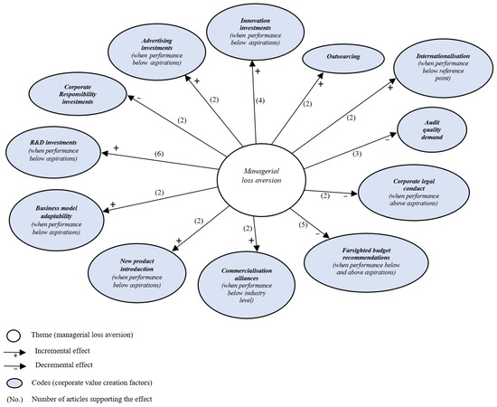 - A thematic map was depicted to draw and explain findings. In particular, the thematic map shows the incremental and decremental effects of managerial loss aversion on corporate value creation factors, and thus on value creation itself.