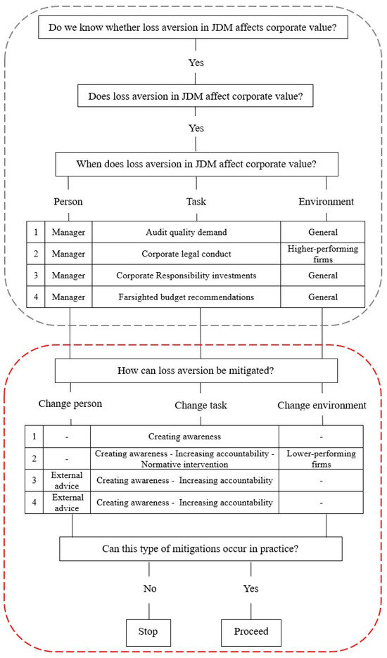 In the second part (contained within the red dotted line), the authors offer preliminary approaches about how to mitigate managerial loss aversion with the main aim of improving the corporate value creation process. In particular, the second part of the framework suggests potential solutions for researchers, namely changes in JDM conditions (i.e., the person in charge of the decision, task and environment) to successfully mitigate loss aversion. In other words, all changes to the JDM conditions aimed at reducing managerial loss aversion are de facto considered potential debiasing strategies. Indeed, debiasing strategies are defined as strategies to mitigate the influence of decision biases and to enhance rational decision making (Kaufmann et al. 2009). Definitively, in effectively imposing organisational changes (i.e., change person in charge of a task, change the task, change the task environment), these debiasing strategies should be planned and agreed upon at a corporate strategic level (Kreilkamp et al. 2020). In any case, it has been repeatedly highlighted how debiasing strategies, initially formulated in theory, need to be operationalised to assess their effectiveness and efficiency within different business settings (Kaufmann et al. 2012). This literature review, in agreement with other business (Kaufmann et al. 2010) and non-business (Ludolph and Schulz 2018) literature reviews, offers potential debiasing strategies for future empirical research.