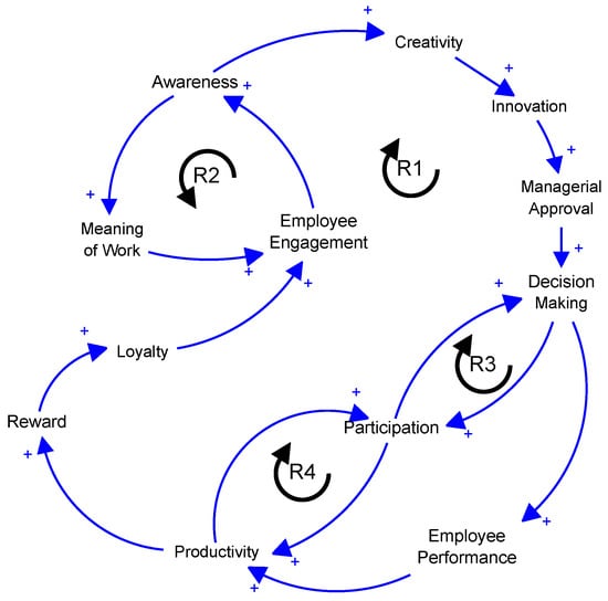 R4 exemplifies a reinforcing feedback mechanism in which heightened productivity serves as a motivator for increased employee participation. Consequently, this heightened involvement further amplifies productivity. As the level of productivity increases, employees are motivated to enhance their level of engagement and participation in endeavors that facilitate the attainment of productivity improvements. Increased employee engagement leads to the recognition and adoption of more effective methodologies, consequently enhancing the overall operational efficiency.