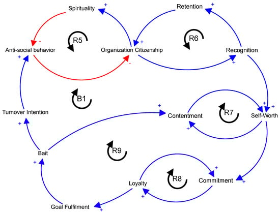 B1 begins with antisocial behavior, which has a negative impact on employees’ willingness to exhibit OCB, which is a desirable behavior. When a display of OCB occurs, it results in acknowledgment and an increased perception of personal value, ultimately promoting stronger dedication to the organization and employee allegiance. The concept of loyalty, in its reciprocal nature, plays a role in achieving set goals, and can be additionally motivated by the use of incentives or rewards. Nevertheless, the loop also exposes a potential drawback: as turnover intention escalates as a result of diverse factors, such as the existence of antisocial conduct and inadequate responses to it, it can engender a reoccurrence of these antisocial behaviors. This loop highlights the significance of effectively managing antisocial behavior, as it can have an impact on organizational citizenship, recognition, self-esteem, commitment, loyalty, and even turnover intention, ultimately shaping the overall organizational culture and employee engagement.