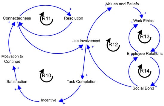 R10 starts with the premise that a strong sense of connectedness among employees positively influences their job involvement, leading to higher rates of task completion. The successful completion of tasks frequently leads to the provision of incentives or acknowledgment, thereby augmenting employee satisfaction and fostering their continued engagement and enthusiasm in their work. The consistent drive to achieve goals and maintain motivation strengthens individuals’ perception of being interconnected with their peers and the overall institution, thereby cultivating a reciprocal and mutually beneficial association. This loop underscores the significance of fostering a culture of connectedness and engagement in the workplace, as it not only enhances task completion and job satisfaction but also sustains employee motivation and their sense of belonging within an organization, contributing to overall organizational success.