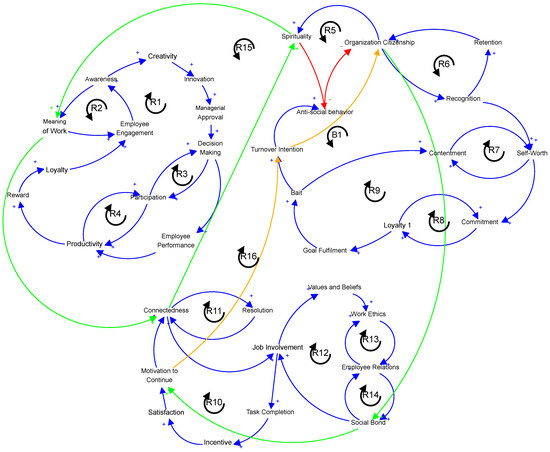 The interconnectedness of these three previous CLDs (captured on Figure 4) demonstrates a holistic view of organizational dynamics, workplace culture, and employee engagement. The fundamental element of this integrated model centers around the connection between spirituality and the significance of work, emphasizing the impact of an individual’s spiritual values and sense of purpose on their interpretation of meaningful work. The connection subsequently expands throughout the interrelated loops, thereby demonstrating its noteworthy influence on multiple aspects of the organization. The relationship between spirituality and the significance attributed to work has an impact on an individual’s sense of connection within an organizational context. When employees discover a sense of purpose and alignment with their spiritual values within their work, it fosters an increased sense of interconnectedness, thereby establishing a basis for favorable interactions and relationships. The relationship between individuals’ motivation to persist in their work and their intention to leave their current employment underscores the significant influence of motivation on employee retention. Enhanced levels of motivation, which are frequently cultivated by engaging in meaningful tasks and experiencing a sense of spiritual congruence, have been found to diminish any intentions to leave an organization, thereby promoting its stability and continuity. Furthermore, the link between turnover intention and organizational citizenship suggests that when employees have a reduced inclination to leave an organization, they are more prone to participating in pro-organizational behaviors, including engaging in citizenship activities that yield benefits for both the organization and their colleagues. The relationship between organizational citizenship and social bonding underscores the beneficial impact of citizenship behaviors on employee relationships. Employees who are actively involved and make positive contributions to the organization have a tendency to cultivate stronger interpersonal relationships with their colleagues, thereby promoting increased collaboration and unity within the workplace. In general, this model demonstrates the potential of spirituality and the significance of work in fostering a positive organizational culture that is marked by interconnectedness, motivation, decreased intentions to leave, behaviors that support the organization, and enhanced social relationships. It highlights the intricate web of relationships within an organization and underscores the importance of aligning individual values and beliefs with the broader goals and values of the organization to create a harmonious and engaged workforce.