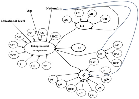 This model demonstrates that entrepreneurial competencies are interconnected and influenced by demographic factors such as nationality, educational attainment, and age. The general hypothesis covers all entrepreneurial competencies, while H1, H2, and H3 provide a more detailed view, exploring how these competencies may vary as a function of personal and contextual characteristics.