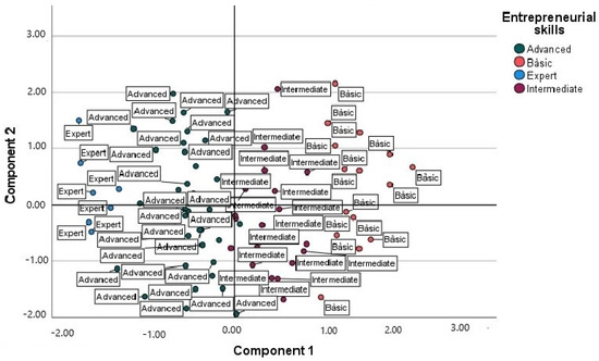 Figure 3 suggests a clear differentiation between immigrant women who have high levels of entrepreneurial skills (expert and advanced) and those with more basic skills (intermediate and basic). The former seem to be better represented by components that capture more advanced and specific skills, while the latter are associated with a more general or incipient skill profile. This distribution can provide a guide for targeted training programs, depending on the level of capacity of immigrant women, and underscores the need for differentiated strategies that address the specific needs of each group.