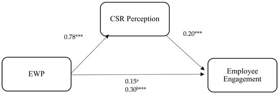 Mediation of CSR perception. Note: *** p < 0.001. a regression coefficient of EWP on employee engagement with mediator of CSR perception. b regression coefficient of EWP on employee engagement without mediator of CSR perception.