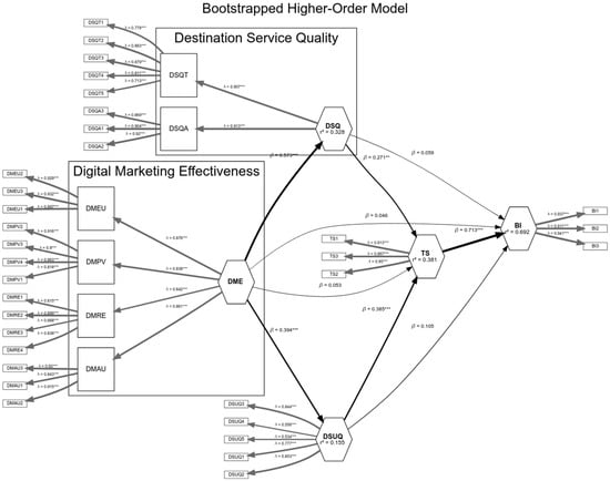 The bootstrapped results reveal that digital marketing effectiveness (DME) positively impacts destination service quality (DSQ) and destination sustainability quality (DSUQ). However, DME does not directly influence tourist satisfaction (TS) or behavioural intention (BI). Instead, DSQ and DSUQ play significant mediating roles, directly affecting TS, which in turn has a strong influence on BI. These findings are consistent with previous studies (Sánchez-Teba et al. 2020) that suggest digital marketing’s primary role is in shaping perceptions of service and sustainability quality, rather than directly influencing satisfaction or behavioural outcomes. This supports the notion that tourists are more likely to develop positive attitudes towards a destination based on their perceived quality of services and sustainable practices rather than just the marketing messages they receive.