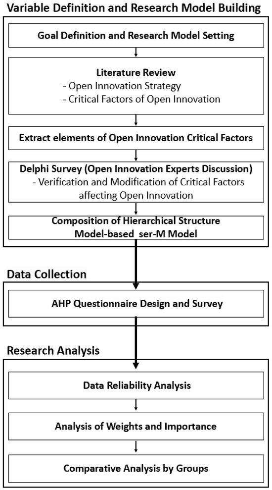 As illustrated in Figure 2, this study was conducted in three phases. In the initial phase of the study, the critical factors of open innovation were identified. To this end, we collated and synthesized the findings of prior studies on the critical factors of open innovation strategies. Subsequently, in consideration of the characteristics inherent to the open innovation strategies of high-tech companies, a Delphi survey was conducted with the objective of identifying the factors that contribute to the success of such strategies.