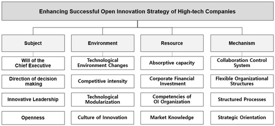 High-tech firms face constant innovation and challenges due to a rapidly changing tech environment. Open innovation strategies are an important solution for fostering rapid and efficient innovation by leveraging external capabilities. This study explores the critical factors that influence open innovation strategies in high-tech companies, assessing their importance and providing key insights for promoting these strategies. Through a comprehensive literature review and expert interviews, 16 key factors impacting open innovation were identified. A hierarchical research model was developed using the ser-M (subject, environment, resource, mechanism) framework, focusing on subject, environment, resource, and mechanism for a corporate strategy analysis. A survey and an AHP analysis were conducted with 30 participants, comprising engineers and open innovation experts, all with over a decade of experience in the field within Korean high-tech companies. The analysis focused on four critical elements: subject, environment, resource, and mechanism; subject emerged as the most critical factor for successfully implementing open innovation strategies. Specifically, the will of chief executives, the direction of decision-making, and technological environment changes were found to be significant contributors. The consensus between engineers and experts confirms that while environmental and resource factors are vital, strong leadership and effective decision-making are paramount for successful open innovation in high-tech companies.