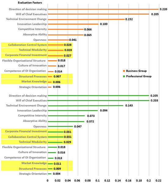 The results of the critical factor analysis of open innovation in high-tech companies, as presented in Table 4, represent the findings of the overall AHP analysis. The weights and priorities of each factor are presented. Local weights are the weights and priorities measured between each sub-area factor. Global weights are the weights and priorities measured across all sub-areas. Critical factors are the weights and priorities measured across all sub-areas. In this context, the term “global weights” refers to the weights and priorities that were calculated on the basis of all sub-regions.