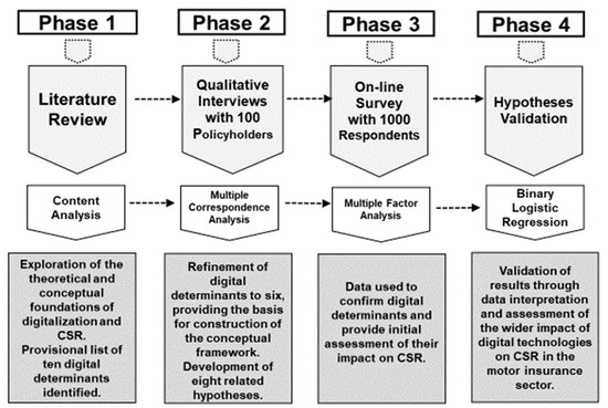 There were four main phases in this research study (Figure 3). Phase 1 entailed a comprehensive review of the pertinent literature. A qualitative approach was adopted to identify key themes related to digitalization that could also potentially advance sustainability in the insurance sector. Content analysis was used to extract and categorize key themes from the relevant documentary sources, focusing on recurring themes and important variables. This produced an initial list of ten key themes, which were termed “digital determinants”. Then, in Phase 2 of the study, a questionnaire was developed based on the digital determinants identified in the literature review, and this was used in direct face-to-face interviews with over 100 policyholders and insurers in the automobile sector to gather their views on the impact of the digital determinants in terms of the possible enhancement of CSR amongst insurers.