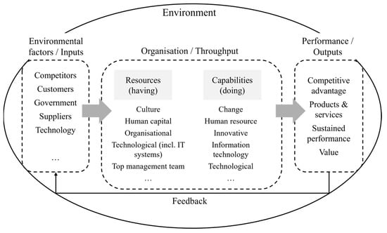 The theoretical framework illustrated in Figure 1 attempts to integrate the open-systems concept and the resource-based theory. This study conceptualises the organisation as an open system that is influenced by (and influences) its environment and copes with constant change. Digital technologies are one of the significant triggers of change.