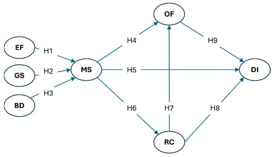 Research model. Environmental factors (EF), government support (GS), internal barriers (BD), management support (MS), organisational flexibility (OF), risk-tolerant culture (RC), digital business intensity (DI).