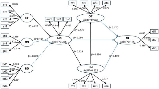 The model is characterised by complementary mediation. The mediated paths from EF and GS through MS, RC, and OF to DI are calculated with a 5% confidence interval. The total indirect effects of EF on DI (0.200) and of GS on DI (0.038) are positive and significant.