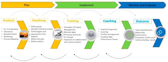 | Implementation | Proposal and Implementation of Agile Approach Define the roles Define training needs Coaching Pilot testing |