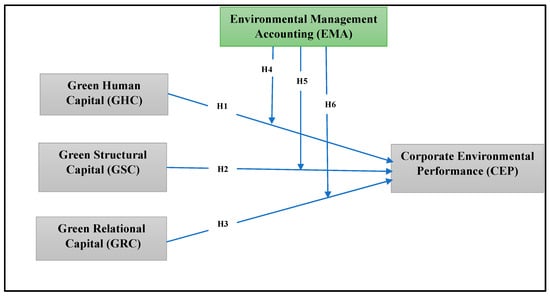 The current study introduces a novel theoretical construct that significantly extends the existing body of literature pertaining to environmental performance. This study’s primary contribution lies in its comprehensive examination of the interrelationships between GIC and CEP, with a particular emphasis on the moderating role of EMA. The relevance of this research is heightened by its focus on validating the proposed framework within a critical industrial sector in the emerging economy of Egypt. This paper is structured as follows: Section 2 provides a theoretical foundation for this study by formulating hypotheses regarding the influence of GIC subcomponents (green human capital, green structural capital, and green relational capital) on CEP. Additionally, this section elaborates on the underlying theoretical framework guiding the research. Section 3 outlines the methodological approach adopted for data collection and analysis. Section 4 presents the empirical findings, including a detailed discussion of the statistical results. Section 5 offers a comprehensive interpretation of the findings, drawing conclusions and addressing the implications of the research. Finally, Section 6 highlights this study’s limitations, potential future research directions, and the broader implications of the findings for both academic and managerial practice.