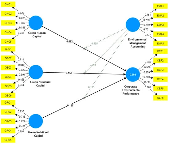 Regarding the direct-influencing hypotheses, the results of this study demonstrate a significant and positive influence of green intellectual capital components (GHC, GRC, and GSC) on corporate environmental performance (CEP). As shown in Table 5, the beta coefficients, t-values, and p-values indicate the strength and significance of these relationships. Specifically, GHC has a particularly strong positive impact on CEP, with a beta-value of 0.482, a t-value of 11.233, and a p-value of 0.000. Additionally, GRC and GSC also exhibit significant positive relationships with CEP, with beta-values of 0.187 and 0.153, respectively, and corresponding t-values and p-values indicating statistical significance. These findings support the direct-influencing hypotheses (H1, H2, and H3).
