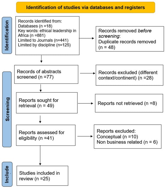 Only papers written in English were considered and other sources except peer-reviewed sources were excluded. This further reduced the output to 441 papers. The limitation of the search for leadership in business disciplines resulted in 125 articles with some duplicates. After the removal of 48 duplicates, a total of 77 papers were considered. In the second stage, abstracts were reviewed to ensure that they were the right fit and finally, the output was sorted based on their methodology. No date was limited in the search, but as shown in Table 1, the 25 studies were published between 2014 and 2024. Some of these publications were in reputable journals including SA Journal of Human Resource Management, Social Responsibility Journal, Journal of Management, Journal of Business Ethics, Business Ethics and Leadership, and SA Journal of Industrial Psychology, amongst others. The Sub-Saharan nations included in the review are Ghana (N = 4), Nigeria (N = 4), South Africa (N = 14), Botswana (and SA) (N = 1), Tanzania (N = 2), the Congo (N = 1), and Uganda (N = 1).