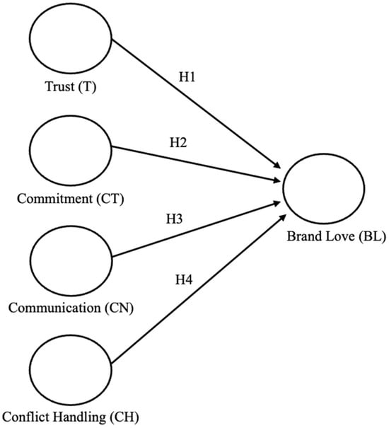 The literature on conflict handling (CH) has defined a set of concepts that describe it as the ability to identify, address, and resolve disagreements between the parties involved in a way that promotes mutual understanding and includes the willingness to openly discuss possible solutions when problems arise (). According to (), conflict has a negative effect on the quality of the relationship, although others believe that conflict can enhance business relationships (). Moreover, it has been shown that conflict handling has a positive influence on the loyalty of bank customers. Furthermore, it is described as the ability to prevent conflicts from becoming potential threats and affecting the organization to a greater degree (). Brands committed to quality have taken an important step in their performance as a high-performance company, but they must be willing and able to manage their conflicts in an edifying and beneficial way to mature their relationship while promoting a more affectionate bond (; ; ). Conflict handling, trust, and personal bonds contribute to successful marketing relationships and suggest that these dynamics develop when brand representatives and consumers have fostered strongly cooperative ties (; ; ). Based on the details, the following study hypothesis is proposed: