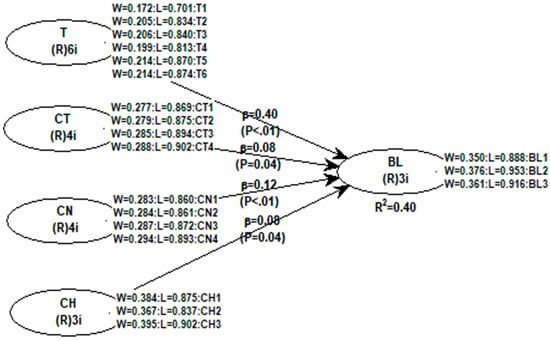 In the present study, the R2 for the BL coefficient was 0.40. Therefore, this R2 value has a relatively high and acceptable level. The value of this study suggests that the variables T, CT, CN, and CH represent a high percentage of the variance in BL. Table 5 and Figure 2 show the results of the hypothesis tests and the evaluation of the path coefficients. The results show the significant positive effect of T on BL (H1), CT on BL (H2), CN on BL (H3), and CH on BL (H4).