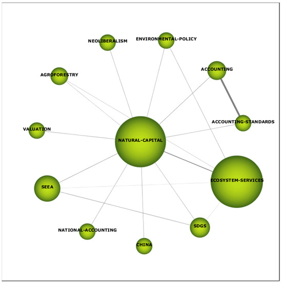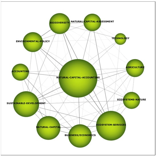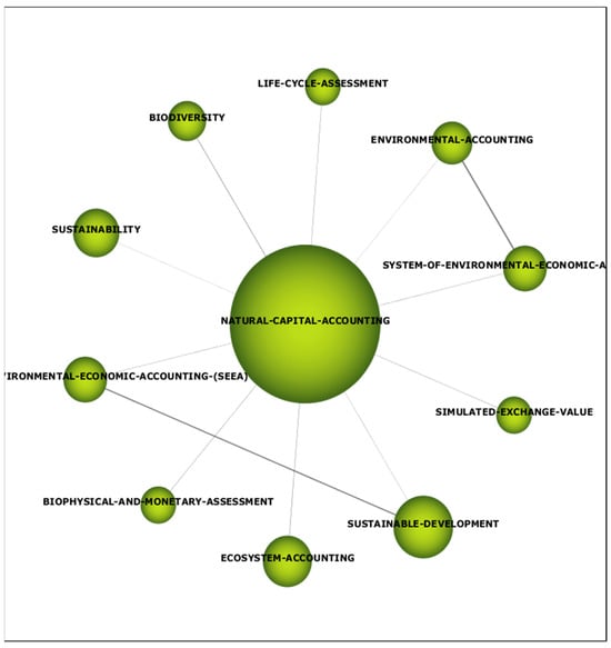 Once this analysis was completed, clusters for the two topics were prepared. Figure 4 shows the cluster for “Natural Capital Accounting” and we can see a star-shaped network characterized by the presence of keywords correlated with the cluster theme. The main themes are clearly ecosystem services correlated with environmental policy. Different natural capital accounting systems also appear, such as SEEA and SDGS. Other accounting terminology is also observed in the network. However, despite the importance detected in the literature review, biodiversity does not appear as part of the network of published articles on natural capital.