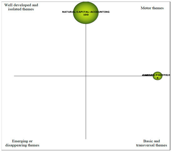 For the entire period analyzed (1993–2023) with word groups, the driving theme, as Figure 6 shows, is “Natural-capital-accounting”, while the theme “carbon footprint”, as Figure 7 shows, is positioned as the basic theme and driving theme.