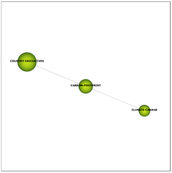 The “Carbon footprint” network (Figure 8) for all periods in 1993–2023, shows that the most important keywords in the group are “national initiatives” and “climate change”. The keywords are strongly correlated with carbon footprint. The cluster of words “country initiatives” includes a list of countries and regions using different approaches to combat climate change and reduce carbon emissions. The “carbon footprint” network has gained prominence in recent years due to the enormous growth in the number of environmental policies that have taken place in the last 10 years.