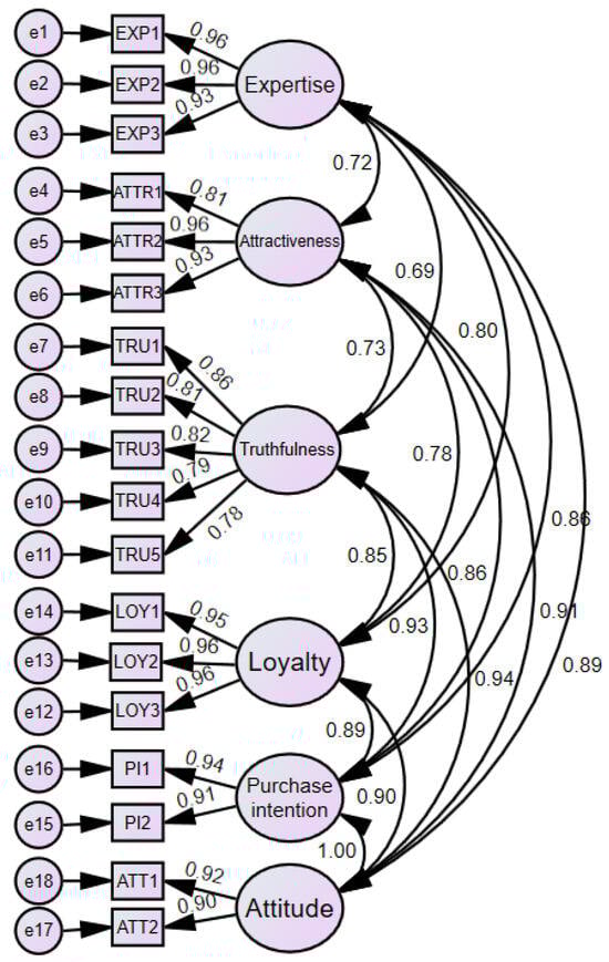 We construct a multigroup structural model starting with Hussain and Ali (2021, p. 36) using the same indicators, latent variables, and loyalty as the mediating variable. Initially, we conducted a path analysis to determine the role of the mediating variable, and then used the resulting model in the multigroup structural equation analysis to determine the differences between the two generations of our interest. The conceptual model is shown in Figure 1 below. We constructed the credibility latent variables attractiveness, trustworthiness, and expertise with the same questionnaire as Hussain and Ali (2021). The same procedures have been used to construct loyalty, purchase intention, and attitudes. The validity of the measurement part of the model has been tested with Cronbach’s alpha and confirmatory factor analysis, as follows.