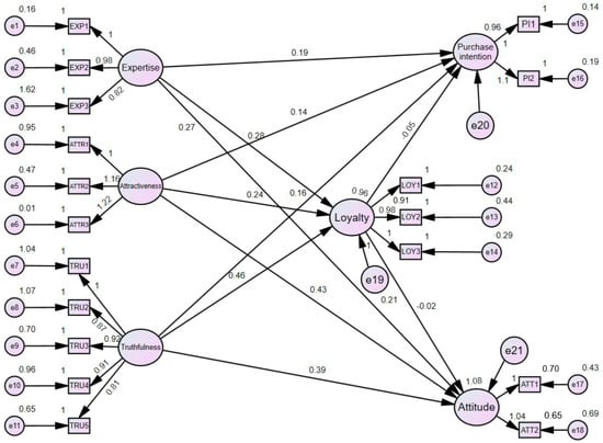 As per previous research, loyalty does have a mediating effect on purchase intentions and attitudes for expertise and attractiveness. Our research shows no mediating effect of loyalty on attractiveness and trustworthiness towards attitude. Analysis with standardized regression coefficients is shown in Figure 3.