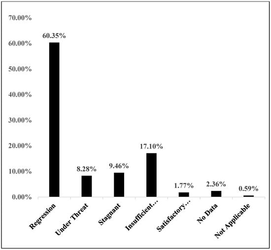 Looking at the chart, we can see that 102 targets (60.35%) are in a backward situation, 14 (8.28%) are under threat, 16 (9.46%) remain stagnant compared to the previous period, and 29 (17.1%) show insufficient progress. A meager three (1.77%) show satisfactory progress, and four (2.36%) lack sufficient data for classification, with one (0.59%) not applicable to the Brazilian context.