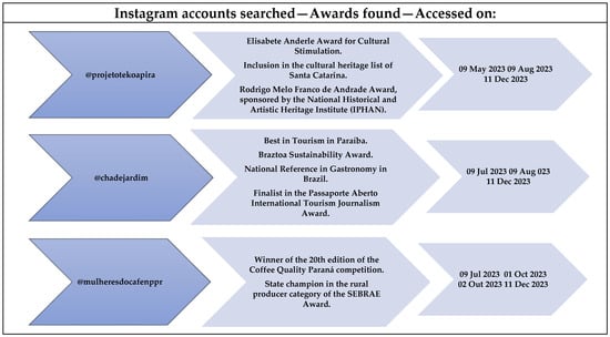 Instagram served as the primary social media platform for this research. Such platforms facilitate novel forms of interaction between individuals and screens, representing spaces for meeting and exchange where visitors seek not only content but also insights into “ways of life” (). To obtain more sources of data for the object under study, information obtained from the official websites of federal and state public bodies such as the Federal University of Paraíba (UFPB), the Federal University of Paraná (UFPR), the Federal Institute of Santa Catarina (IFSC), and IDR-Paraná (Institute for Rural Development of Paraná—Iapar-Emater) was considered. These bodies have been supporting and developing extension and pedagogical training projects for the development of tourist activity in these communities.