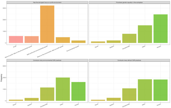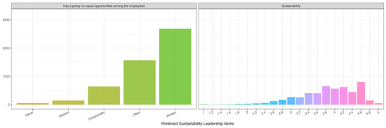 There is a visible variation across different sustainability items. Respondents prioritize gender equality, ethics, and equal opportunities in the workplace more frequently than other sustainability items. Surprisingly, the distribution of responses for environment-related items is denser in the middle. That is, respondents seem to put less emphasis on the environment than on gender. Below is a detailed graph with bar plots for categories within each sustainability item as well as the aggregate sustainability barometer score (see Figure 2).