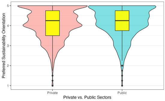 Preferred Sustainability Orientation Index by Sector. The plot features violin plots that illustrate the kernel density of responses across public-private sectors and sustainability scores. Boxplots depict key statistics for each sector, such as the minimum, median, and maximum values and the 25th and 75th quartiles.