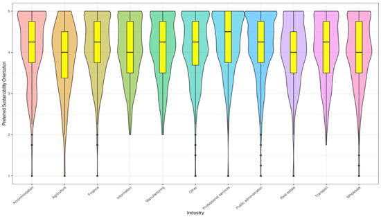 Preferred Sustainability Orientation Index by Industry. The plot features violin plots that illustrate the kernel density of responses across different industries and sustainability scores. Boxplots depict key statistics for each industry, such as the minimum, median, and maximum values and the 25th and 75th quartiles.