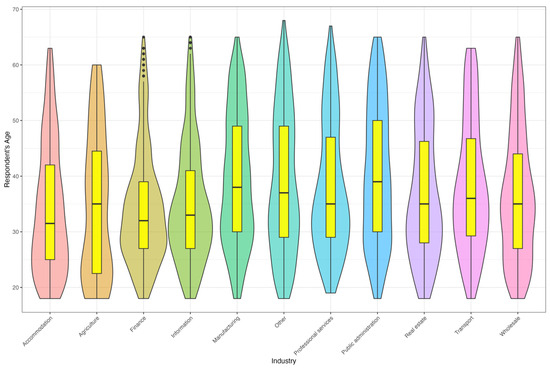 Respondents’ age by industry. The plot features violin plots that illustrate the kernel density of responses across industries and respondents’ ages. Boxplots depict key statistics for each cluster, such as the minimum, median, and maximum values and the 25th and 75th quartiles.