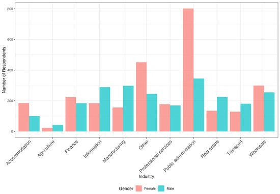 To get a further sense of the distribution of the demographic characteristics within each industry, we explore variations of gender and age within each industry. There does appear to be some variation in the age of respondents across industries (see Figure 5). For example, the youngest respondents work in Accommodation, Finance, and Informational Technologies. Agriculture has the most equally spread distribution of respondents throughout the age brackets (18–65). The median age was highest for Public manufacturing and Public administration sectors.