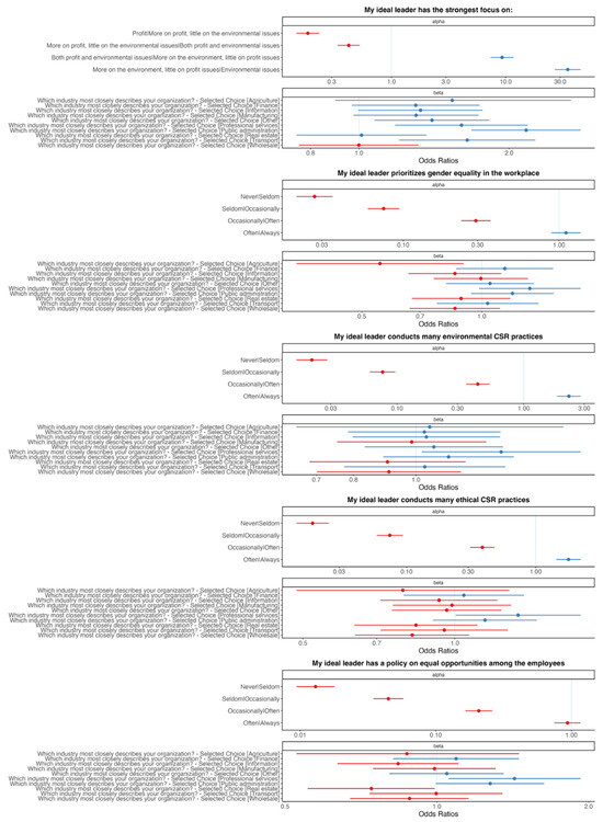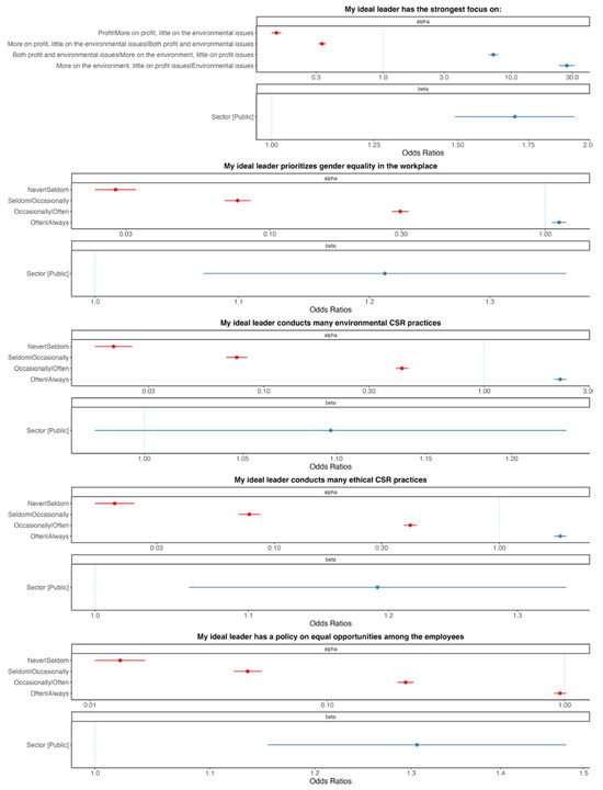 - represents the ordinal dependent variable for each of the five sustainability variables: (1) Q13–51. My ideal leader has the strongest focus on, (2) Q10–52. My ideal leader prioritizes gender equality in the workplace, (3) Q10–53. My ideal leader conducts many environmental CSR practices, (4) Q10–54. Conducts many ethical CSR practices, (5) Q10–55. Has a policy on equal opportunities among the employees.