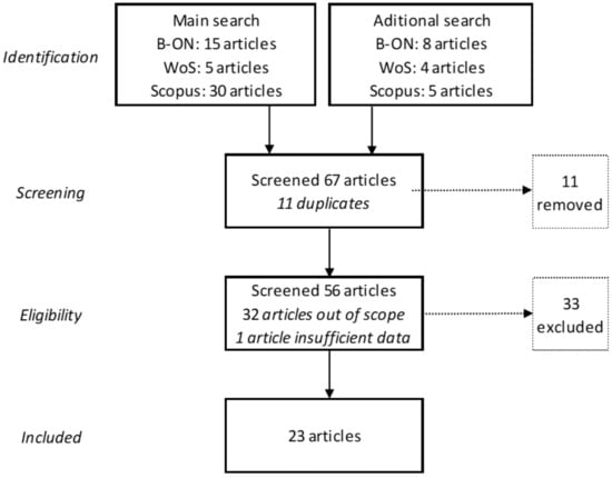 The search process and data gathering were conducted in April 2023. Following the utilisation of the search terms on both platforms, a total of 67 articles were retrieved. In an initial analysis carried out using the MS Excel 2018© software, 11 duplicated articles were identified and subsequently eliminated. Subsequently, a more comprehensive analysis was performed on the remaining set of 56 articles, involving a thorough examination of abstracts, keywords, and, where necessary, the complete article content. According to Moher et al. (2009), SLR is an iterative process wherein researchers may need to make adjustments to their research procedures. In order to ensure a sound analysis and selection process, the scope of this study was carefully structured. Consequently, only conceptual or empirical articles that focus on identifying attributes defining GenZ and their impacts on EB and TM were included. As a result, 32 articles that did not align with these research objectives were excluded. Additionally, one article was removed due to insufficient detailed information for analysis. Consequently, the final selection consisted of a total of 23 articles (refer to Figure 2).