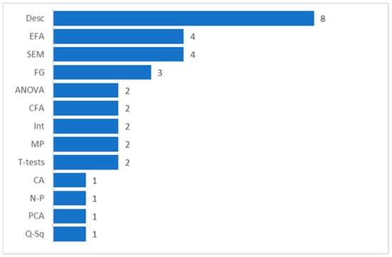 With the exception of a singular article, all other articles in this compilation reflect inquiries of an empirical nature. In the examination of the outcomes garnered from empirical studies, a diverse range of statistical techniques were employed, albeit with a notable emphasis on less sophisticated methods, such as descriptive analysis and exploratory factor analysis (see Figure 6).